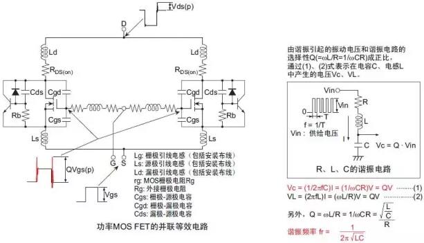 在并聯功率MOS FET時未插入柵極電阻而直接連接時發生的柵極寄生振蕩。高速反復接通、斷開漏極-源極電壓時,在由柵極-漏極電容Cgd(Crss)和柵極引腳電感Lg形成的諧振電路上發生此寄生振蕩。當諧振條件(ωL=1/ωC)成立時,在柵極-源極間外加遠遠大于驅動電壓Vgs(in)的振動電壓,由于超出柵極-源極間額定電壓導致柵極破壞,或者接通、斷開漏極-源極間電壓時的振動電壓通過柵極-漏極電容Cgd和Vgs波形重疊導致正向反饋,因此可能會由于誤動作引起振蕩破壞。