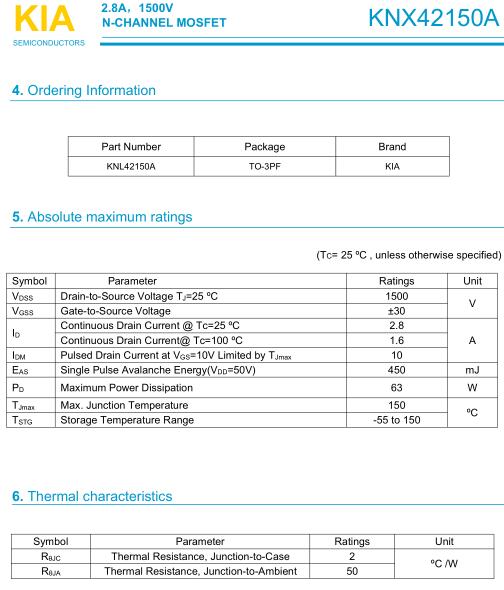 高壓MOS 42150A 2.8A/1500V 規格書-TO-3PF封裝 原廠直銷-KIA MOS管