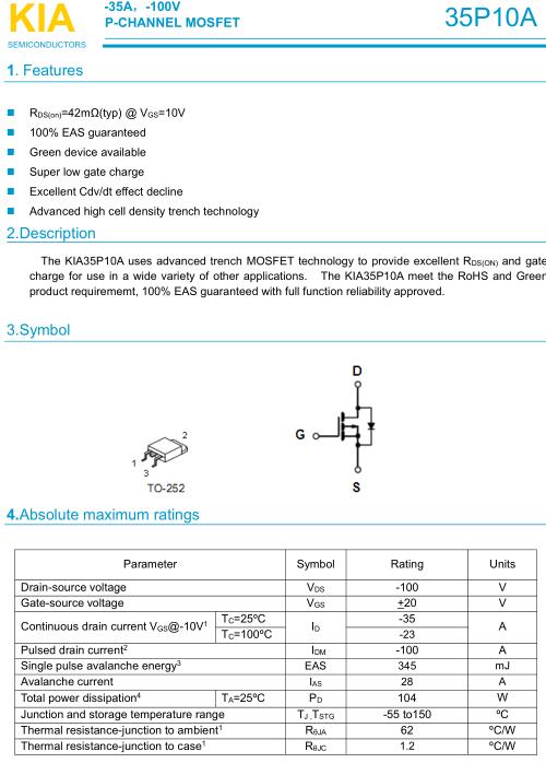 KIA35P10A替代CMD5950 PDF資料參數-KIA35P10A大批量供貨-KIA MOS管