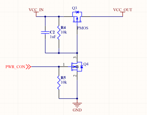 拓展為此電路,針對VCC_IN 與PWR_CON 電壓就沒有強制的要求了。當PWR_CON為高電平的時候,NMOS導通PMOS的柵極被拉低到低電平,PMOS導通VCC_OUT有電壓輸出;反之,當PWR_CON為低電平時,NMOS關斷,從而使PMOS也斷開,這樣就完成了VCC_IN輸出電壓到VCC_OUT的控制。