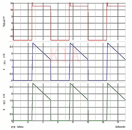 該基座電壓使初級漏電中的電流斜降至0 A,并使次級漏電電流斜升以將電流傳輸到負載。當兩個重載輸出時,電流在整個1-D周期持續流動,輸出電壓平衡良好,如圖2所示。