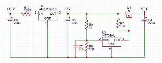 HT7050A,是一個5V電壓檢測的IC,VDD小于5V的時候,輸出低電平,大于5V的時候,輸出高阻抗。所以,結(jié)合R9跟R6的分壓電路,當(dāng)輸出為5.5V時,U3的VDD為5V,當(dāng)電壓再高的時候,就輸出高阻抗,關(guān)斷MOS,切斷電源。