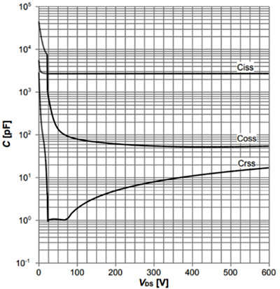 首先介紹超級結半導體開關切換瞬時特性。因為半導體設計趨勢仍在降低開關損耗以提升產品功率密度,即降低在開關切換過程中V-I 交越的損耗,常見半導體廠商的做法為將開關等效輸出電容(Coss)特性設計為非線性曲線: