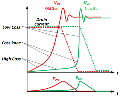 隨著制程技術演進,Coss變化曲線變壓更為急劇,這在新老代的MOSFET可明顯比較出性能差異。如下圖右為比較新老代MOSFET的Coss特性與開關損耗的差異。