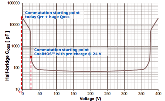 通過加入的預充電電路,在二極管模式下工作的MOSFET便可以在通道開啟前預充至特定的電壓,例如24V。 如此便可大幅的降低 Qoss及Qrr相關的損耗。 因此可以大幅提高CoolMOS在CCM Totem Pole PFC的整體性能。
