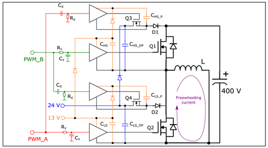 另外還需要兩個電壓源來驅動半橋和低壓MOSFET(13V)以及MOSFET漏-源端電壓(24V)。 此外,驅動器輸入端包含的Rx-Cx和Ry-Cy濾波器為PWM信號設定正確的時序,不需額外的控制信號。