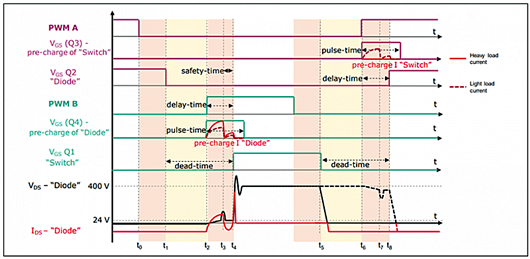 因此,預充電的Q4會在t2開啟(圖五c),預充電電流流經Q4到D2到Q2的網絡中,這種預充電流的的幅度必須高于流經Q2體二極管的續流電流。 在預充電流結束時(t3),Q2的漏-源極電壓被預充電至24V。