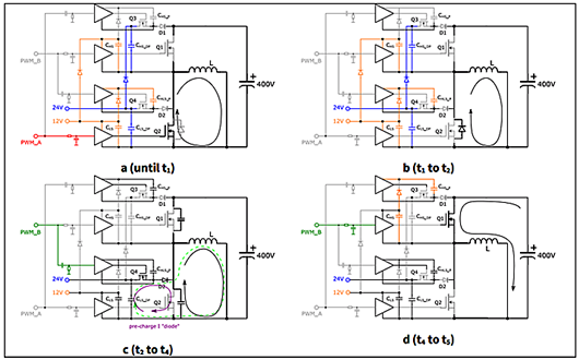 建議的預充電解決方案需要為半橋中的每個功率開關器件配備額外的器件:高壓肖特基二極管(圖中的D1和D2)和一個低壓的MOSFET(圖中的Q3和Q4)。