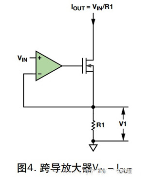 需要跨導放大器(voltage_in/current_out)時,可使用一個單電源運算放大器、一個BJT或FET(MOSFET通常是最佳選擇,因為它不存在基極電流誤差)以及一個定義跨導值的精密電阻來組成,如圖4所示。