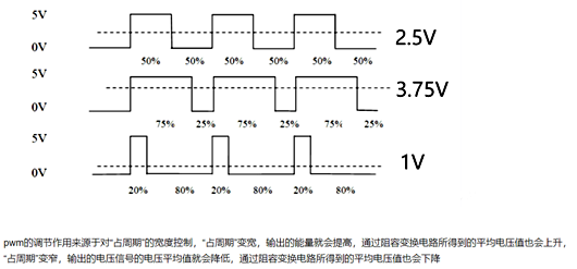 比方說 占空比為50% 那就是高電平時間一半,低電平時間一半,在一定的頻率下,就可以得到模擬的2.5V輸出電壓 那么75%的占空比 得到的電壓就是3.75V。