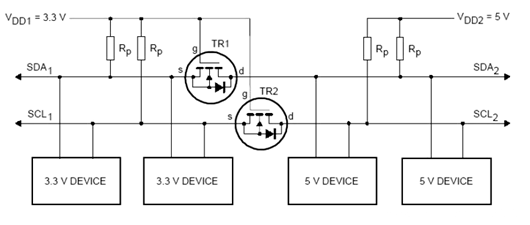 雙向電平轉換電路,如下圖所示,是 NMOS管雙向電平轉換電路,R2和R3可根據實際情況添加或去除。適用于低頻信號電平轉換,價格低廉。 導通后,壓降比三極管小。 正反向雙向導通,相當于機械開關。電壓型驅動,需要一定的驅動電流,而且有的應用也許比三極管大