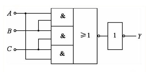 如果作以下變換:Y=AB+AC+BC,則可利用一個與或非門加一個非門實現,其邏輯電路圖如圖2.1所示。