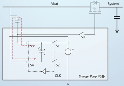 C0 是具有快速充電和放電速度的小電容,而 C1 則是具有大負載能力的大電容。因此,通過S1和S2(以及S3和S4)的頻繁切換, C0 上的電荷可以不斷傳輸給 C1,而 C1 的負端連接至電池電壓 (VBATT)。最終,NMOS由一個大于 VBATT 的電壓驅動。