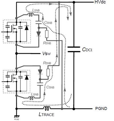 下圖所示為非放電型RCD 緩沖電路動作時的放電路徑。因為上臂的尖峰朝向PGND、下臂的尖峰朝向HVdc,放電流經(jīng)由RSNB 流動,不那么受線路電感影響。