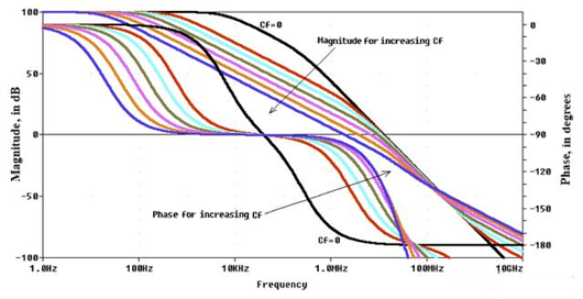 使用圖1的PSpice電路,得到圖2的幅度/相位圖,表明C?的存在導致極點頻率分裂。具體地,C f的值越高,極點頻率越遠,因此中頻區域的相移越接近-90°。