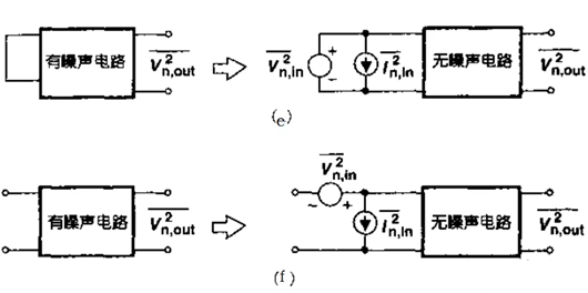 為解決這個問題,我們用一個串聯(lián)電壓源接一個并聯(lián)電流源一起來模擬輸入?yún)⒖荚肼?,如圖(d)所示,這樣如果前級電路的輸出阻抗假設(shè)值很大,從而減小了Vn的作用,但In的在輸入端產(chǎn)生噪聲。