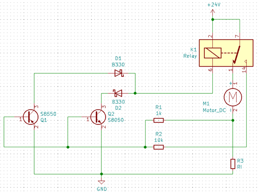 電路的大致原理圖Q如圖所示。其中,K1為帶常開、常閉輸出的繼電器,M1為直流電機,R3為電流采樣電阻,D1D2為持續電流大于繼電器工作電流的二極管。整個電路輸入為+24V和GND。當需要電機正轉時,在+24V和GND上加正電壓,電機即可正轉。當需要電機反轉時,將+24V和GND反接,即電路中網絡標號+24V接電源地,網絡標號GND接電源負,電機即可反轉。當遇到限位或堵轉時,繼電器Q切換,電機斷電停止運行,只有重新在+24V/GND上電或切換電機運行方向才可解除保護。