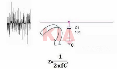 當(dāng)?shù)皖l時(shí),電容C由于阻抗Z比較大,有用信號可以順利通過;當(dāng)高頻時(shí),電容C由于阻抗Z已經(jīng)很小了,相當(dāng)于把高頻噪聲短路到GND上去了。