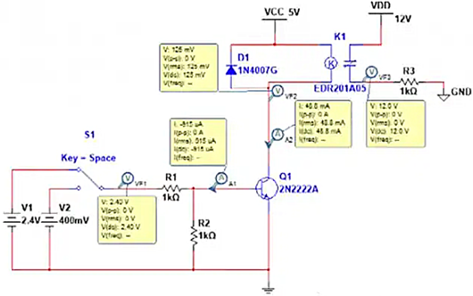 2)高電平輸入時,VF1=2.4V, VF3=12 V,繼電器觸點處于導通狀態(常開型吸合狀態),VF2=0.125V,A1=915uA,AM2=48.8mA,說明晶體管處于飽和導通狀態,而繼電器線圈流過電流接近額定電流40mA。